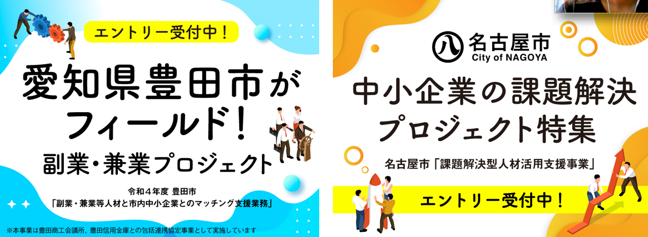 豊田市は昨年度から引き続き2回目の実施、名古屋市は初めての外部人材受入れの事業となります。【豊田市】令和4年度 副業・兼業等人材と市内中小企業とのマッチング支援業務(豊田市産業労働課)